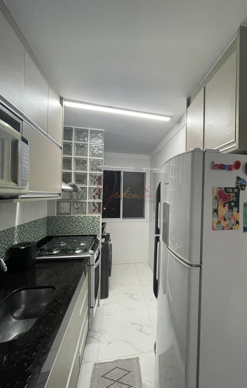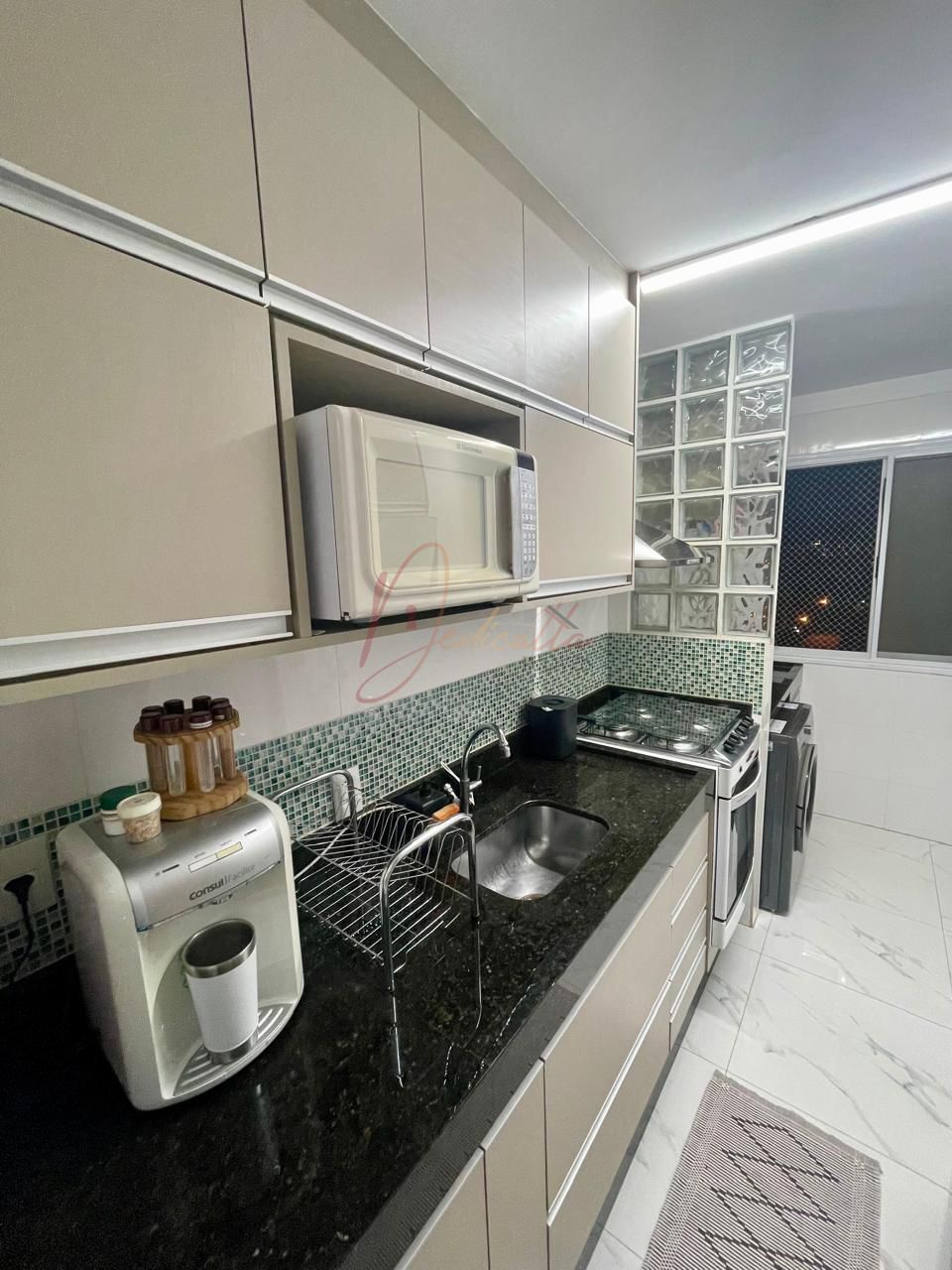 Apartamento com 2 dormitórios, sala para dois ambientes com painel de TV, cozinha com balcão de granito planejada com armários e área de serviço integrada, além de banheiro com box de vidro, espelho e gabinete, vaga de garagem coberta