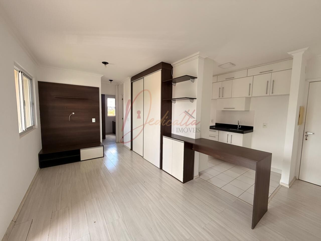 Com dois dormitórios bem arejados e um banheiro social com acabamento de qualidade, o imóvel se destaca pela integração inteligente de seus ambientes. A cozinha em estilo americano amplia a sensação de espaço e se conecta perfeitamente à área social, sendo totalmente equipada com móveis planejados de excelente padrão que garantem organização e sofisticação ao dia a dia.