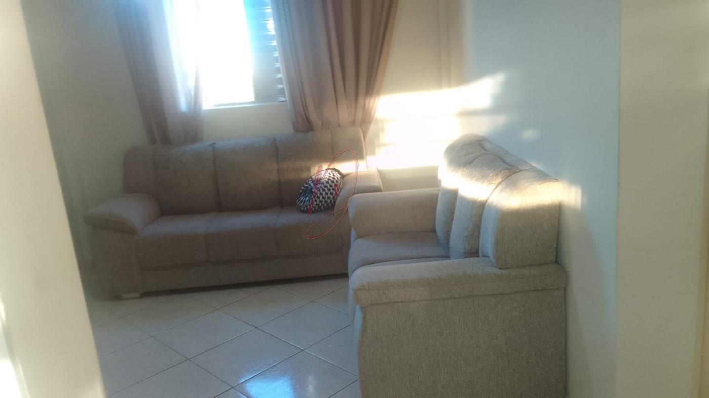 Apartamento com 02 dormitórios, sala ampla para dois ambientes com ventilador de teto, cozinha integrada com lavanderia, banheiro social com armários, e vaga de garagem coberta.